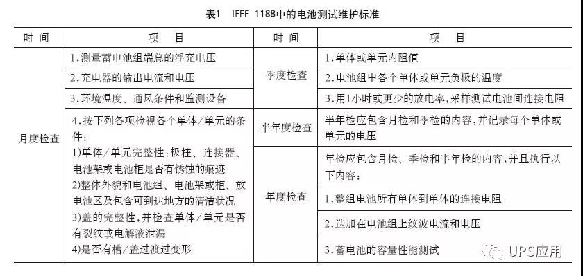 第二個(gè)問(wèn)題使用維護(hù)的問(wèn)題,表1為國(guó)際電池測(cè)試維護(hù)標(biāo)準(zhǔn)。